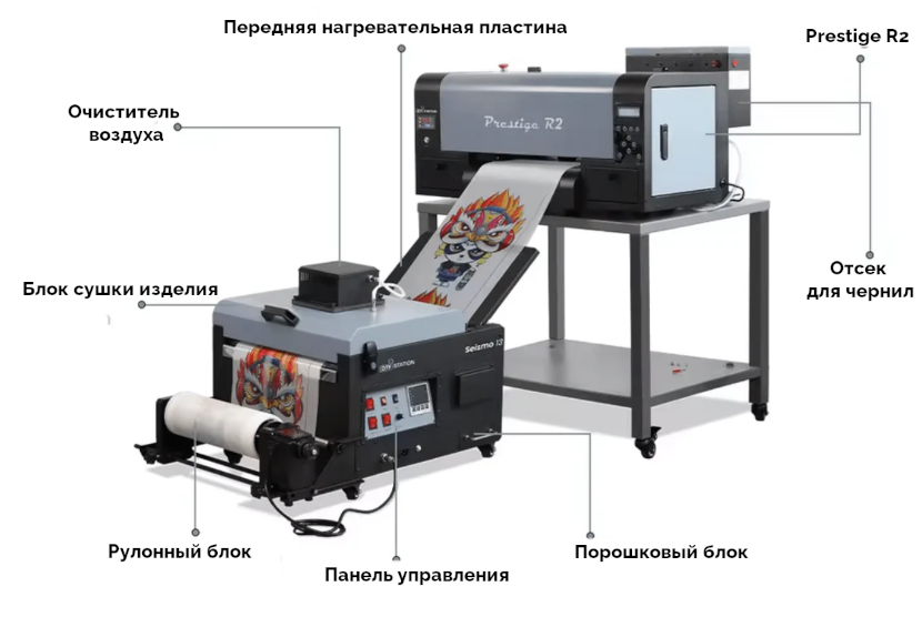 Одним из преимуществ Prestige R2 является сочетание стоимости и функционала. Полный комплект оборудования, включающий систему фильтрации, чернила, порошок и сушильный модуль можно приобрести при бюджете, который значительно меньше затрат на крупную линию производства. При этом устройство позиционируется как профессиональное решение для коммерческой эксплуатации.