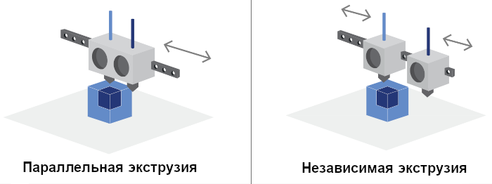 Независимый двойной экструдер (IDEX) — две печатающие головки перемещаются независимо друг от друга по оси X: