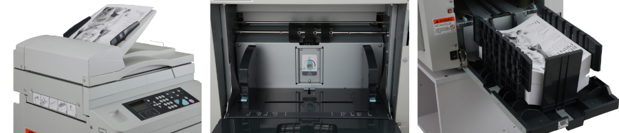 Автоподатчик оригиналов (ADF), позволяющий автоматически объединить два разных документа на одном листе-оттиске. Дополнительная функция «Автозакладка» позволяет вставлять цветную разделительную ленту между заданиями даже во время высокоскоростной печати. Это автоматизирует процесс разделения тиража на партии (по заказам, по фамилиям) без остановки машины и ручного вмешательства.