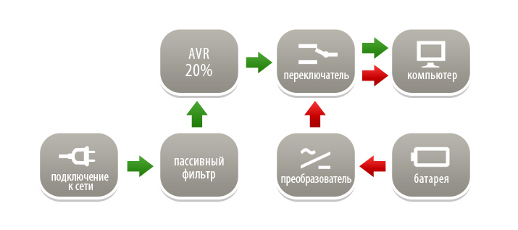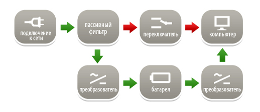 Stand-by — здесь напряжение сети подается через схему пассивной фильтрации непосредственно в нагрузку. При значении входного напряжения меньше установленного уровня источник бесперебойного питания переключается на работу от батареи.