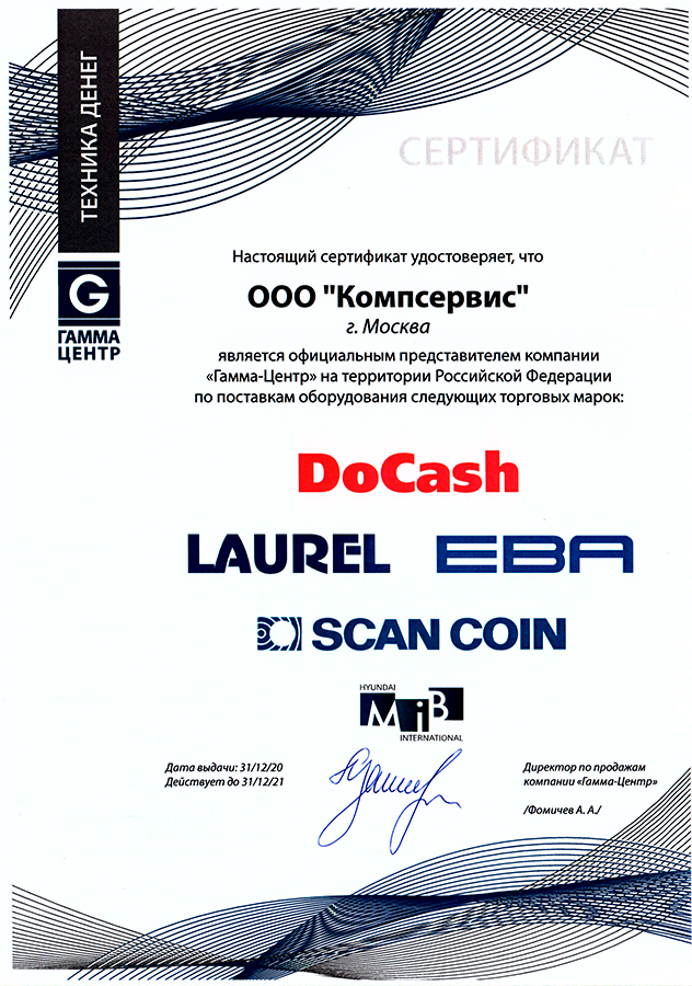 Сертификат подтверждает, что ООО "Компсервис" является официальным дилером Scan Coin