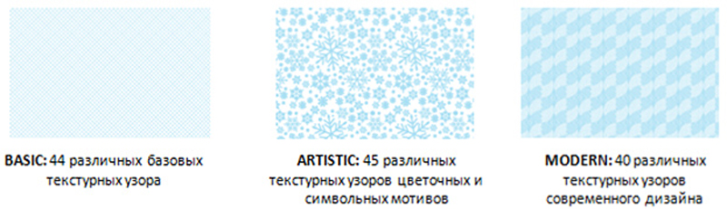 Библиотека ARTISTA Texture Library, встроенная в растровый процессор Mimaki RasterLink6, насчитывает 129 образцов готовых текстур для создания на поверхности изображений дополнительных визуальных и тактильных эффектов. 3D-текстуры могут быть легко применены в Adobe Illustrator (версия CS или выше) и воссозданы на материале с помощью прозрачного лака. Использование готовых текстур для финишного лака позволяет создавать более сложные по дизайну и более роскошные по виду изделия. В библиотеку включены три группы образцов тематических узоров — BASIC, ARTISTIC и MODERN.