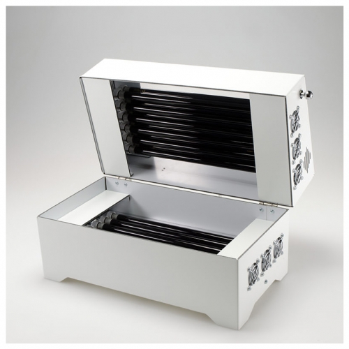 12 встроенных малошумных вентиляторов эффективно отводят тепло от ламп. В предыдущих моделях тепло от ламп не выводилось, что ограничивало работу по времени из-за необходимости в перерыве для остывания ламп. Особенно пауза необходима при использовании синих ламп, они выдают много тепла. Многие производители ставят на ЭК закрытого типа белые лампы, которые греются не так сильно.