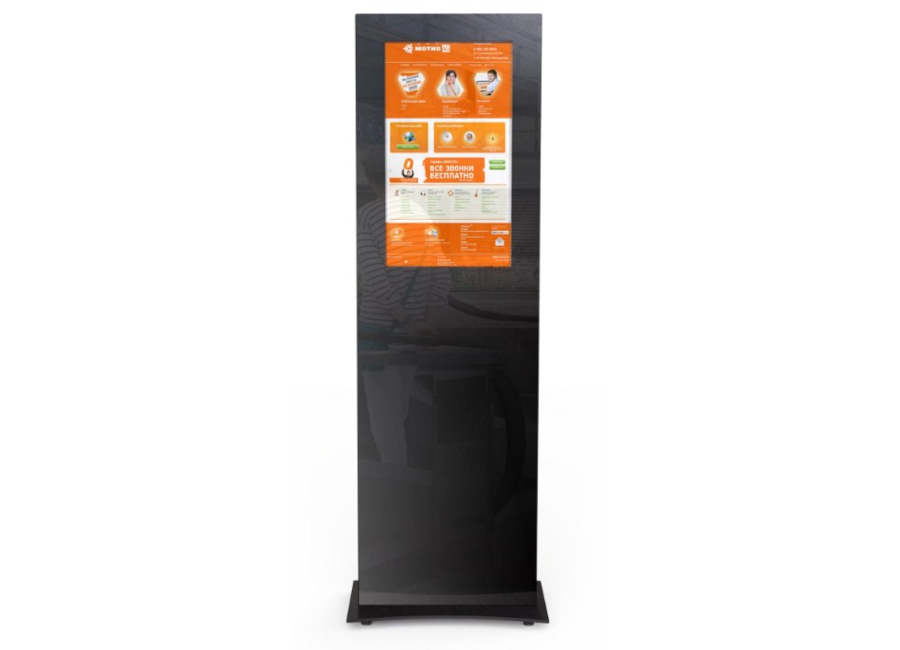 Стойка оснащена информационным экраном 32 дюйма. Ультратонкий экран защищен каленым стеклом на фасадной части киоска.