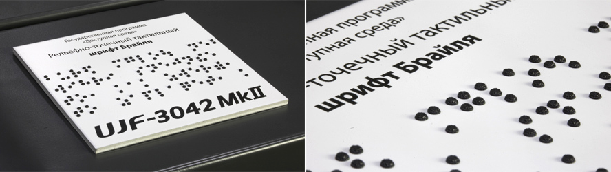 Благодаря возможности печати в несколько слоев и поддержке растрового процессора УФ-принтер Mimaki UJF-3042 MkII e способен с высокой четкостью и в соответствии со всеми международными стандартами воспроизводить тактильный шрифт Брайля — рельефно-точечную азбуку. Чернила УФ-отверждения, которые при печати остаются на поверхности носителя, не впитываясь, позволяют воспроизводить шрифт с предсказуемыми геометрическими характеристиками и необходимой гладкостью. Выпуклые черные точки необходимого диаметра и с необходимой частотой могут быть нанесены на самые разнообразные материалы, включая пластик, металл, картон и пленку с гарантией хорошей осязаемости каждого знака. Специалистами компании Смарт-Т были разработаны специальные методики подготовки макетов и выбраны оптимальные режимы печати, гарантирующие полное соответствие отпечатков государственному стандарту ГОСТ Р 56832-2015. Поэтому «наш» шрифт Брайля — не просто выпуклые точки, как у многих остальных.