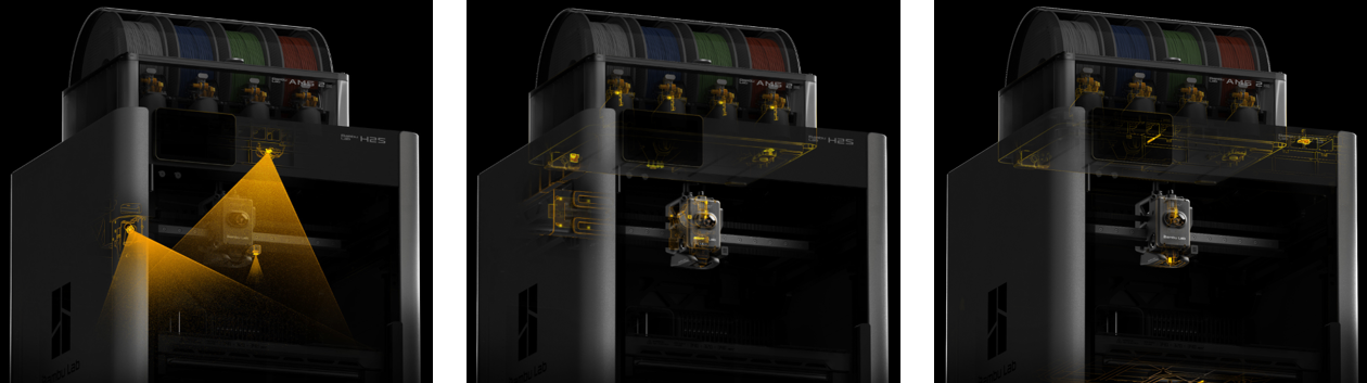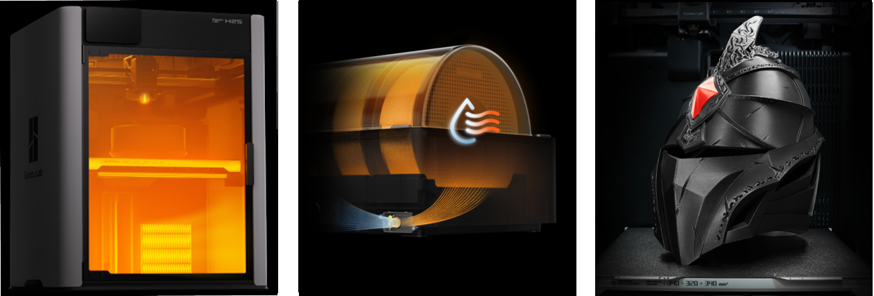 H2D, обладающий технологией активного нагрева камеры до 65°C и высокотемпературным хотендом, температура которого достигает 350°C, осуществляет точный контроль температуры в замкнутом контуре. Эта совершенная система предотвращает коробление и деформацию высокопроизводительных материалов, гарантируя превосходное сцепление слоев.
