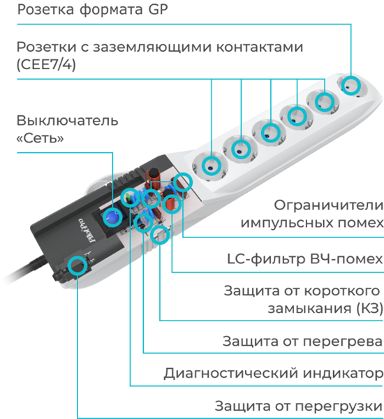 Схема защиты сетевого фильтра Pilot PRO включает в себя: