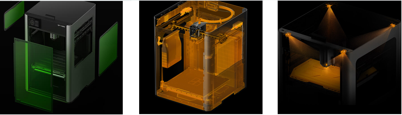 H2D поставляется со стандартными защитными стеклами, позволяющими пользователям безопасно наблюдать за работой лазера. Кроме того, все двери оснащены датчиками, которые срабатывают на аварийную остановку, если их открыть во время работы лазера, обеспечивая безопасность пользователя.