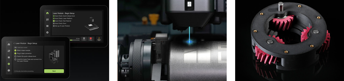Всего одно нажатие – и система автоматически проверяет фокус лазера и определяет параметры материала, полностью исключая необходимость ручной калибровки.