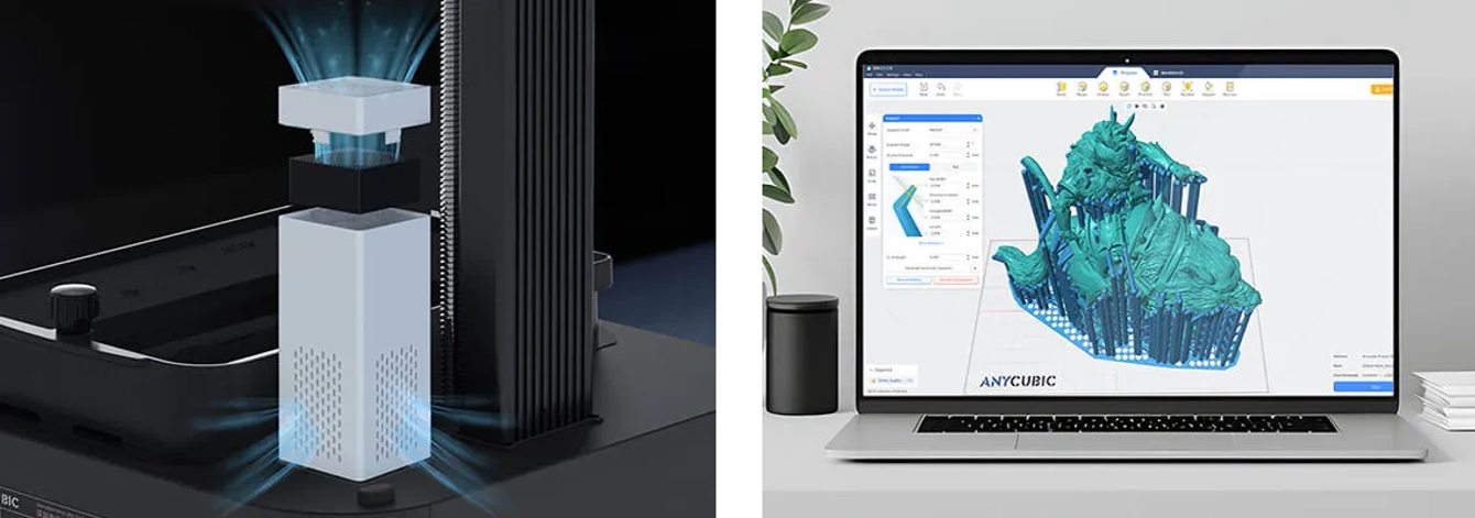 Anycubic Photon Mono 4 может быть оснащен специальной системой фильтрации для обеспечения безопасной работы с фотополимерными смолами. Это карбоновый воздушный фильтр, который эффективно справляется с неприятными запахами и токсичными парами.