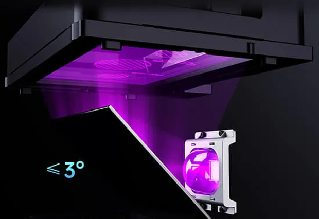 Точность светового потока обеспечивается инновационной системой COB (Chip-On-Board) в сочетании с линзами Френеля. Световые лучи контролируются в диапазоне 3°, что гарантирует равномерное освещение всей области печати.