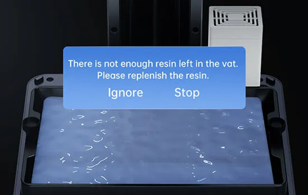 Если уровень смолы в ванночке ниже уровня, необходимого для печати изделий, пользователь получает напоминание о необходимости ее добавления.