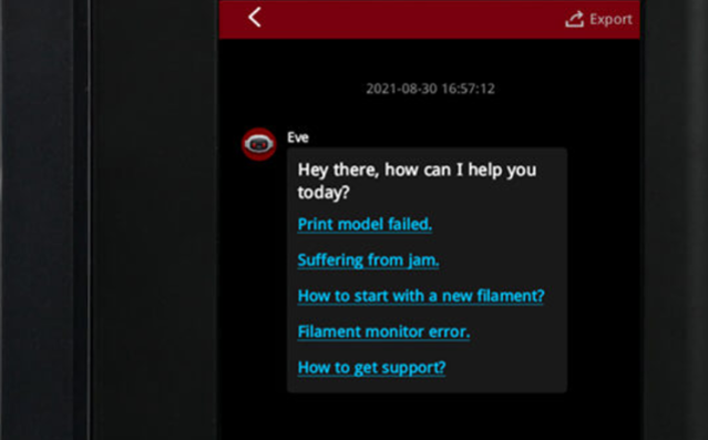 Pro3 Plus HS оснащён встроенной системой EVE, в которую предварительно загружены распространенные проблемы с печатью и соответствующие им решения. Помощник EVE поможет пользователям точно находить и устранять проблемы, которые могут повлиять на итоговый результат печати. Также в нем есть функция, которая напоминает пользователям о регулярных запланированных вмешательствах, чтобы обеспечить своевременное обслуживание принтера. Это помогает сократить время технического обслуживания и сделать его более эффективным.