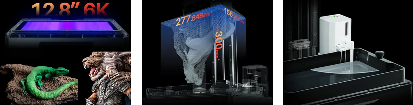 Jupiter SE можно назвать «гигантом среди принтеров» благодаря его внушительным размерам и возможностям. С рабочей областью 277.85 x 156.26 x 300 мм он открывает двери в мир масштабных проектов: от крупных художественных инсталляций до серийного производства деталей. Монохромный 12.8-дюймовый ЖК-дисплей с разрешением 6K (5448 x 3064 пикселей) обеспечивает детализацию, которая превращает каждую модель в произведение искусства. А система автоматической подачи смолы делает процесс печати почти полностью автономным, позволяя сосредоточиться на творчестве, а не на технических нюансах.