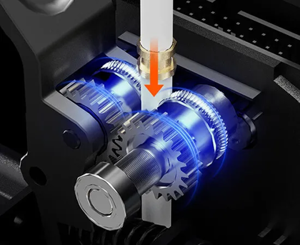 Экструдер с прямым приводом и двумя шестернями обеспечивает превосходную точность подачи материала, а редуктор 5.2:1 обеспечивает стабильную экструзию. Экструдер весит всего 290 г, что повышает стабильность движений. Трубка из титанового сплава повышает эффективность охлаждения и снижает количество засоров, а надежная система нагрева обеспечивает быстрое и равномерное расплавление нити. Сопло с температурой 300°C позволяет печатать на разнообразных материалах.
