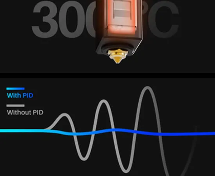 Система сопел принтера, поддерживающая температуру до 300°C, включает в себя удлиненный хотэнд, керамический нагреватель мощностью 60 Вт и прочный латунный нагревательный блок. Такая конфигурация позволяет работать с широким спектром материалов, включая PLA, PETG, TPU, ABS, ASA и нейлон. Автоматическая PID-калибровка сопла гарантирует постоянный контроль температуры, повышая надежность и обеспечивая плавный поток филамента во время высокоскоростной печати.