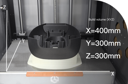 Размер одиночной печати достигает 400 x 300 x 300 мм, двойная печать - 360 x 300 x 300 мм, копирование - 225 x 300 x 300 мм, зеркальная печать - 190 x 300 x 300 мм.Это позволяет создавать крупные детали.
