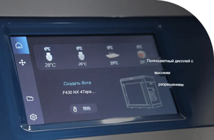 CreatBot F430 NX можно представить как «творческую мастерскую будущего», где два независимых экструдера (IDEX) работают как руки мастера, одновременно создавая детали из разных материалов или цветов. Закрытая рабочая камера с подогревом до 70°C и подогреваемая платформа до 140°C обеспечивают идеальные условия для печати даже самых требовательных материалов. Металлический корпус толщиной 3 мм придаёт принтеру прочность и стабильность, а 5-дюймовый сенсорный экран делает управление интуитивно понятным. Этот принтер — инструмент для тех, кто стремится к совершенству в 3D-печати, будь то промышленные проекты или творческие эксперименты.