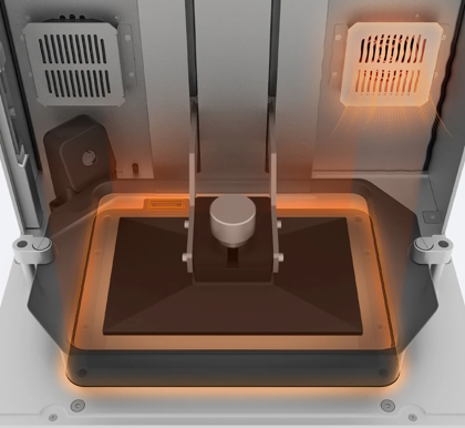 В принтере Sonic LS+ используется двойная система нагрева: нагреватель ванны для смолы и нагреватель камеры для поддержания стабильной температуры печати на уровне ~30°C.