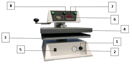 1. Ручка регулировки давления 2. Манометр 3. Нижняя плита 4. Верхняя нагревательная плита 5. Кнопка включения/выключения термопресса 6. Панель управления 7. Кнопки прижима верхней плиты 8. Кнопка экстренного поднятия верхней плиты |