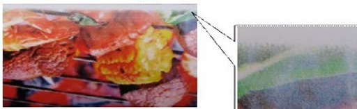 Применение новой микро пьезоэлектрической печатающей головки DX7 позволяет достичь разрешения 1440 dpi. Печатающая голова конструктивно предусматривает два ряда дюз на каждый цвет. Печатающая голова имеет 8 рядов дюз. В отличии от большинства недорогих принтеров, Techno-Jet 160 запитывает голову и управляет ее чернильными каналами симметрично, а не последовательно, благодаря чему полностью устраняется эффект отличия цвета проходов при двунаправленном режиме печати. Фактически машина всегда накладывает цвета в одинаковом порядке вне зависимости от направления движения каретки. Это хорошо видно на изображениях приведенных ниже: