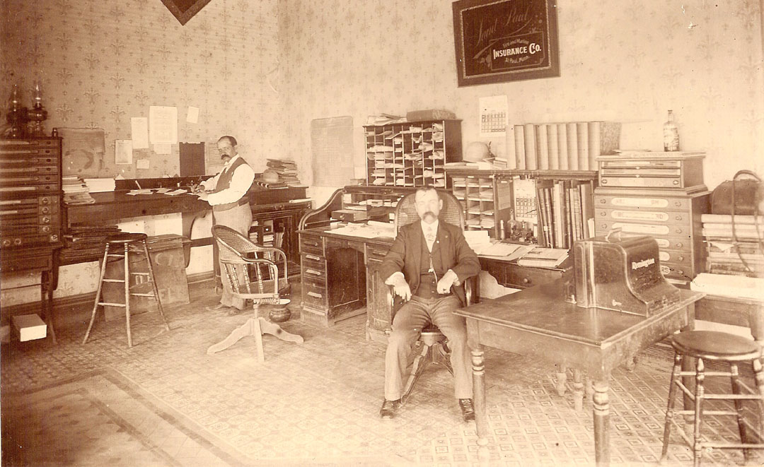 Офис страховой компании в городе Сэнт-Пол, штат Миннесота, 1890. Помимо керосиновых ламп, письменного стола, сейфа и печатной машинки на снимке можно заметить еще один типичный офисный атрибут того времени — плевательницу. |
